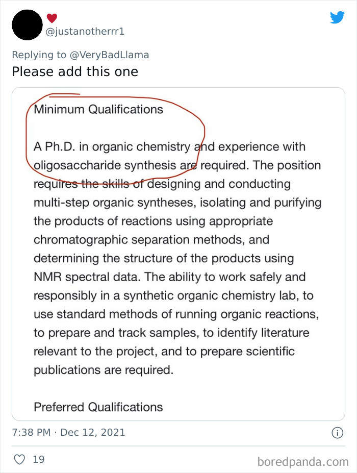And often you don’t need to dig deep to find red flags in a job description. Awful working conditions and unattainable expectations repel potential employees for the sake of their own good. So when Twitter user Janel Comeau shared some examples of disastrous job conditions with the caption “‘nobody wants to work anymore’ starter kit,” people immediately responded by sharing some more. Below is quite a solid collection of jobs that scream “run” from a mile away.