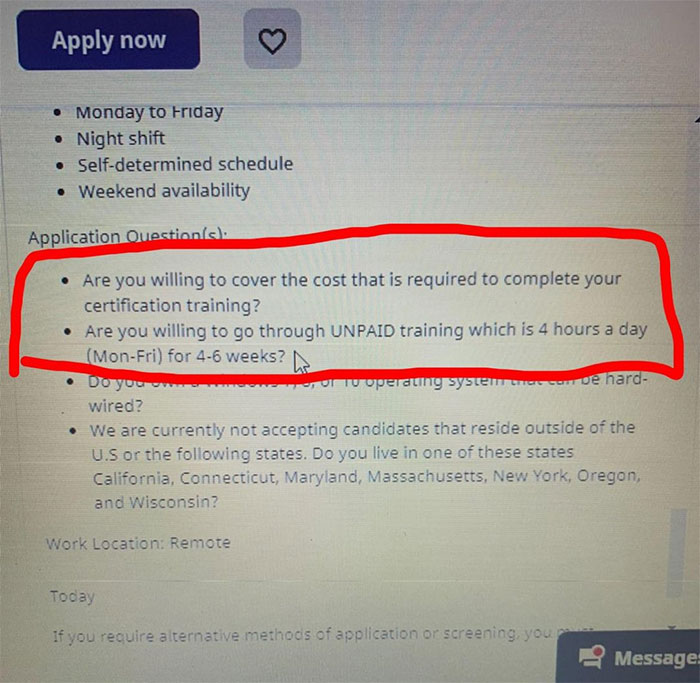 And often you don’t need to dig deep to find red flags in a job description. Awful working conditions and unattainable expectations repel potential employees for the sake of their own good. So when Twitter user Janel Comeau shared some examples of disastrous job conditions with the caption “‘nobody wants to work anymore’ starter kit,” people immediately responded by sharing some more. Below is quite a solid collection of jobs that scream “run” from a mile away.