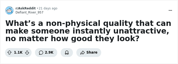 Someone asked “What’s a non-physical quality that can make someone instantly unattractive, no matter how good they look?” and people listed the things that gave them the ick. So get comfortable as you scroll through, upvote your favorites and be sure to share your own examples in the comments below.