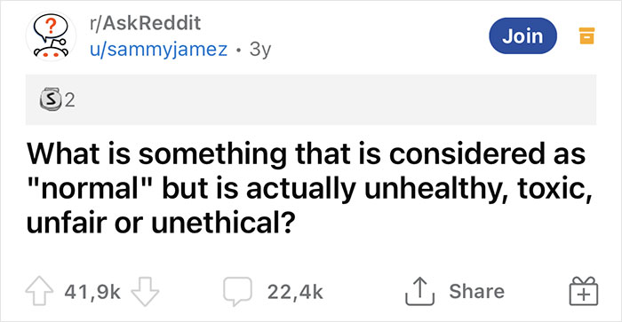 And it turns out, there are many more things that are universally considered as normal, when in fact they’re the exact opposite. It’s just that nobody talks about it. So this Ask Reddit thread has people calling out real-life examples that are “unhealthy, toxic, unfair or unethical” in disguise as perfectly acceptable.