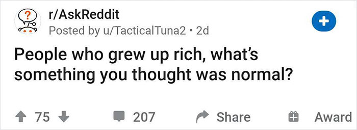 On Friday, Reddit user u/TacticalTuna2 decided to find out more about the way wealthy parents raise their boys and girls, so they asked: "People who grew up rich, what's something you thought was normal?" And their call was answered.