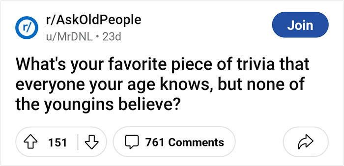So to remind ourselves how different the world was back then, one Reddit user recently asked older adults to share their favorite “pieces of trivia” that people their age know but younger generations might not. Below, you’ll find some of their most fascinating responses, so enjoy scrolling through. And keep reading to find a conversation with Jean Mader and Laura Bettinger of the OK Boomer podcast!
