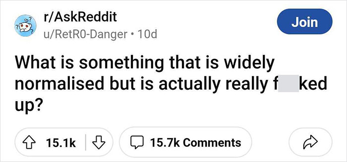 Folks on Reddit recently gathered to discuss such issues, specifically sharing the things that are widely normalized but are actually really messed up in a now viral AskReddit thread.