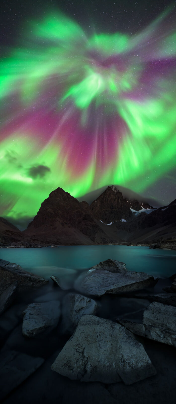 Upon reaching the location, the aurora was exceptionally powerful. I worried that by the time I had sorted all my equipment and scouted my composition, I might miss the main show. Nevertheless, I set up my tripod next to a small pool of seawater, focusing on capturing reflections. At this point, the aurora had slightly diminished, and I had to endure a few rain showers. However, my efforts and perseverance paid off around 9:30 pm when huge green and pink light pillars shot out of the sky—completely mesmerizing!"