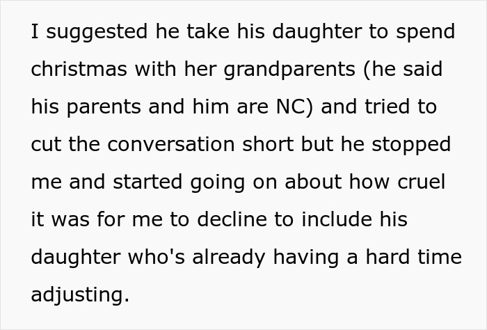 Later, the man texted the author to ask her once again if she would allow his daughter to spend Christmas with her; she declined and was slammed for being selfish.