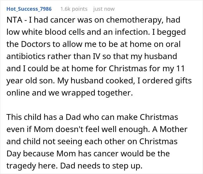 Im confused why the child can't spend it with her father or her MOTHER. Yes i get it she has cancer but i have heard from a lot of moms with cancer that fought to be with thier child on holidays, bd's and etc because it might be thier last. Why throw shame at the op?