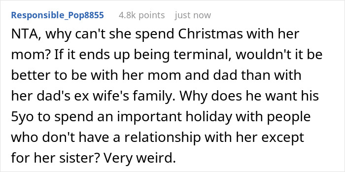 Am I reading this right? A man asks if his ex-wife can include his 5 year old daughter in her families Christmas celebrations because her mother is undergoing treatment for cancer so Christmas for them is not going to be the best. The ex-wife acknowledges his child and hers get along and "adore" each other but she refuses because of "family tradition". Is that right because if so the ex-wife is f***king appalling. What kind of person refuses something like this for a 5 year old? Clearly the father is going through hell and is trying to give his daughter some semblance of a normal Christmas and has reached out to ask for help. Sorry but this person is 100% the arsehole here and I can't even believe some people think she isn't. Whatever she might feel about her ex there is something to be said about basic human decency here.,