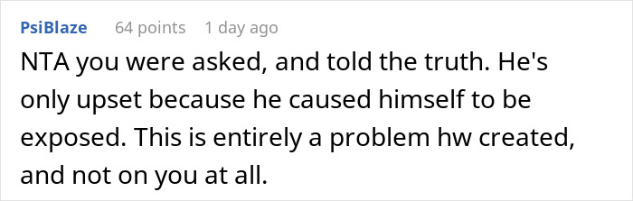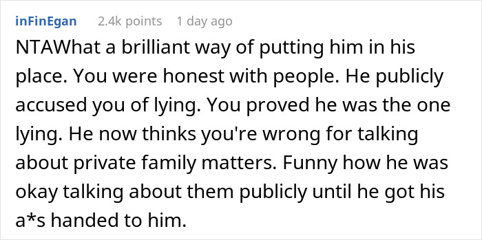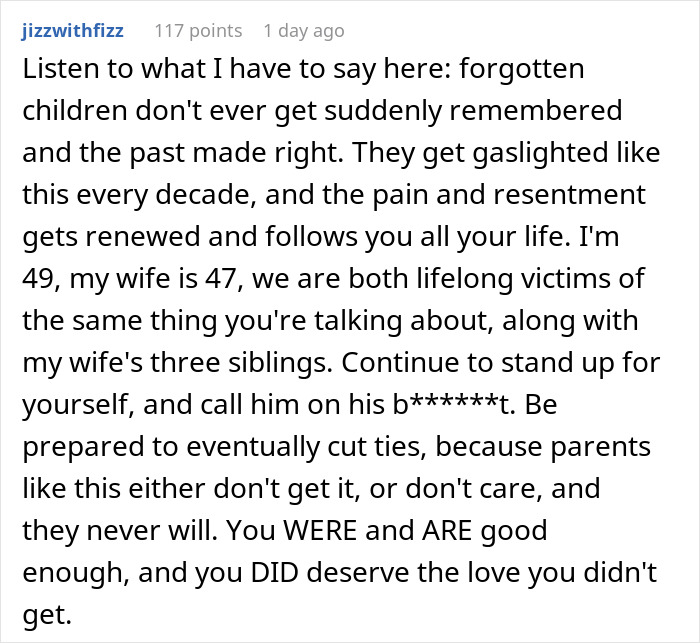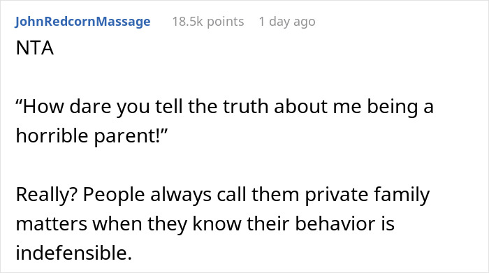 The author got the “Not the A-hole’ badge in this situation. Users also noticed that people tend to call it ‘a private matter’ once they notice that their behavior is indefensible. However, a few members started a different discussion as well: “[Family members are] harassing the dad so nobody notices that for over a decade, they forgot about OP too. Apparently no one noticed that for over a decade, they were never invited to anything having to do with OP.”