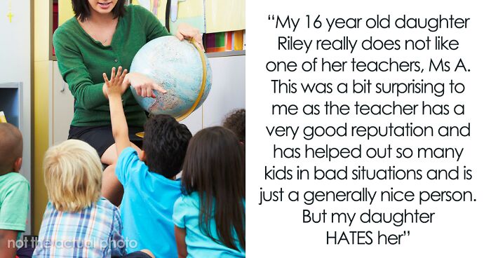 The Original Poster (OP) has 5 children and one of them is 16-year-old Riley. She has a teacher that she really hates, which surprises her mom because Ms. A has a good reputation and, as far as she can tell, is a good person.