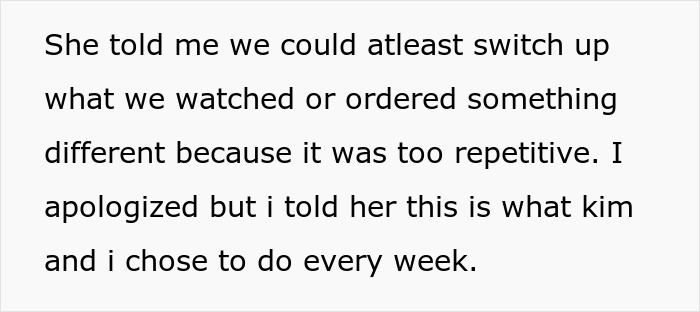 Of course, the OP told her sister about this tradition, and invited her to spend evenings with them. Stacey agreed, and two weeks went quite well, but by the third Sunday, the situation had changed. The author of the post says that the sister refused to join her and Kim this time, and in general “spent the evening moping and huffing”. After Kim left, the OP honestly asked Stacey what happened, and this is what she discovered.