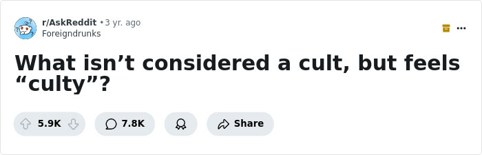 However, the exact definition can vary both in popular culture and academia. So, Reddit user Foreigndrunks wanted to learn more about how different people interpret them and asked everyone on the platform to share real-life examples that dodge the cult label but still reflect the vibe.
