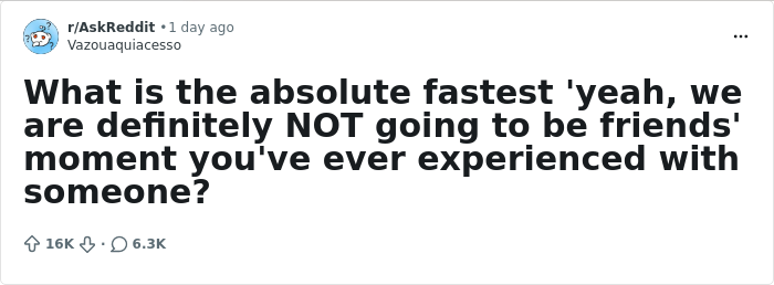 Reddit user Vazouaquiacesso asked others on the platform to share the absolute fastest “yeah, we are definitely not going to be friends” moments they’ve ever experienced, and the responses prove that first impressions aren’t just important—they can be everything.