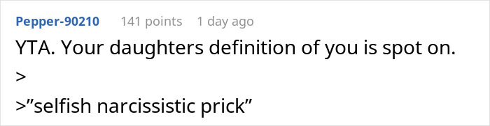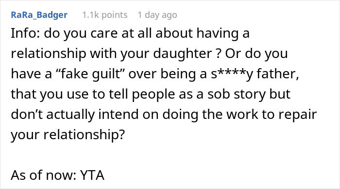 People in the comments were merciless, because the dad was absent through her teenage years and then tried to reconnect after being in a life crisis due to the divorce, but shut her down again after one argument, once again showing that she is not that important in his life. From what they’ve read, redditors didn’t think that the OP cared to have a relationship with his daughter.