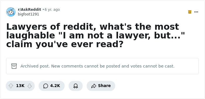 One Reddit thread might give you an idea. One netizen's question revealed just how many folks may be overconfident in legal know-how. Their question "Lawyers of reddit, what's the most laughable, 'I am not a lawyer, but...' claim you've ever read?" brought out many professionals to reminisce about how hilariously wrong some folks have been about law.