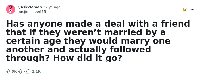Someone asked “Has anyone made a deal with a friend that if they weren’t married by a certain age they would marry one another and actually follow through? How did it go?” and people shared their stories. So get comfortable as you scroll through, upvote your favorites and if you’ve seen (or done) something similar, be sure to share it in the comments down below.