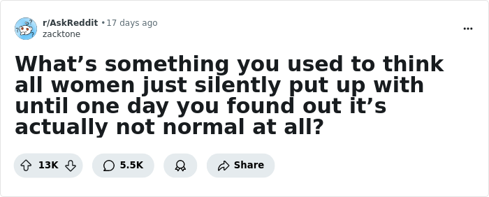 A lot of women are angry about it, as they opened up on Reddit when a user asked them to share such things. Trust me, they didn’t hold back from exposing these “norms,” which are oh-so-problematic! Ladies out there, you might even relate to most of these, so just scroll down to check them out!