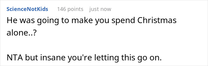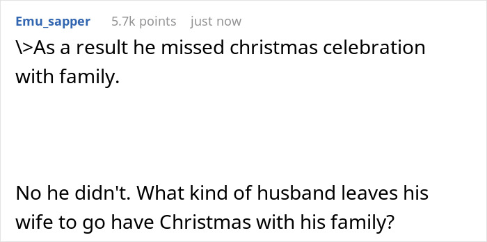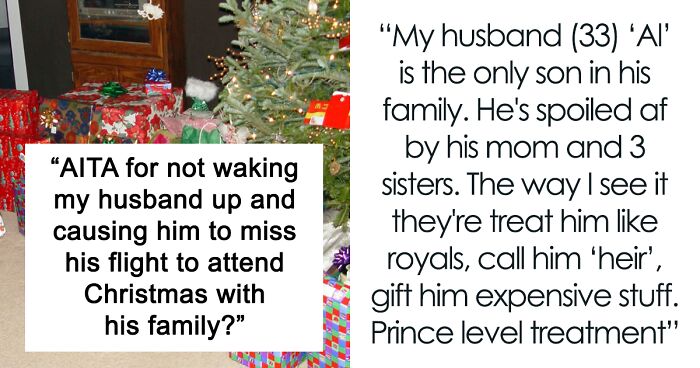 Most commenters are convinced that a husband should celebrate Christmas with his wife, and not with his sisters and mom. If he wanted to see them for the holiday so desperately, then this was his own responsibility – not to sleep through the morning flight. According to people in the comments, the OP’s husband is selfish for leaving her on Christmas and doesn’t actually have a backbone to defend her to his relatives because he likes them fussing over him.