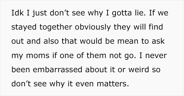 The OP stood up for his moms and he also explained that it doesn’t make sense lying now because if their relationship evolved, the lie would surface and that would be even more awkward.