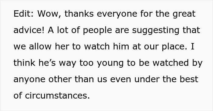 But the mom didn’t feel comfortable with leaving her son at her MIL’s house or her coming to hers to babysit him
