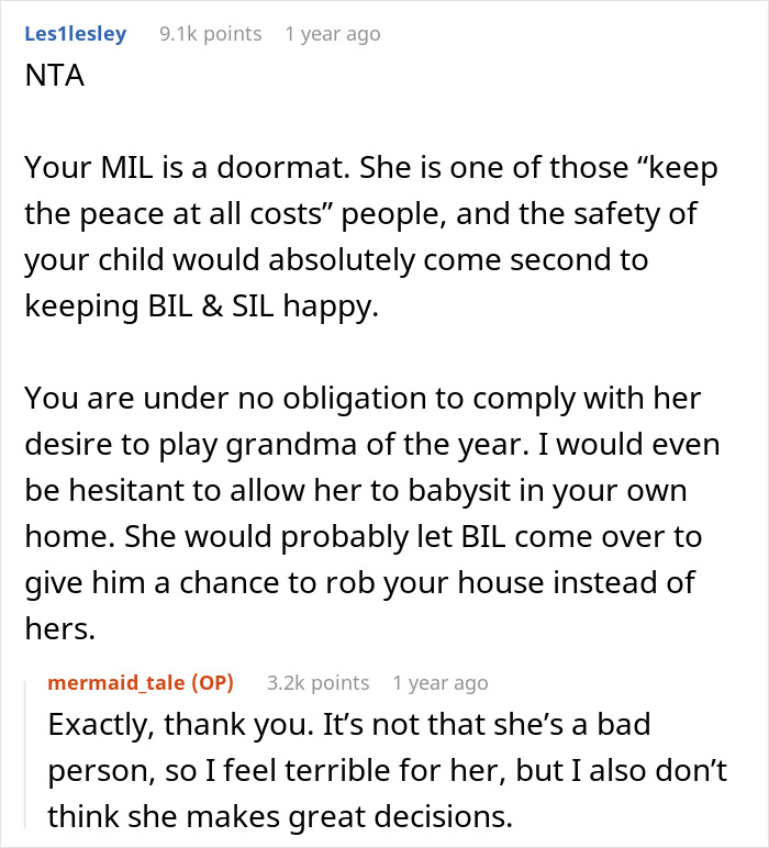Some people in the comments suggested allowing the MIL to come to OP’s house to babysit, but the woman feels that her husband’s mom doesn’t have the best judgment as she is enabling her son’s addiction and her daughter’s awful behavior and she doesn’t understand why it would be dangerous for a baby.