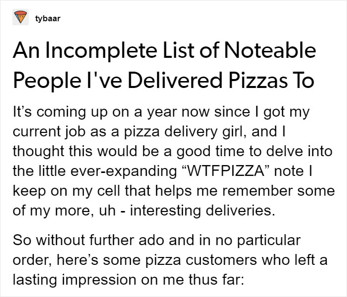 This benevolent bearer of good vibes often gets a unique insight into the everyday lives of ordinary people - we tend to order pizzas when we are relaxed, happy and having a good time. Tumblr user Tybaar realized that her job yielded an absolute goldmine of great stories, and decided to share them with the internet. We are so glad she did!