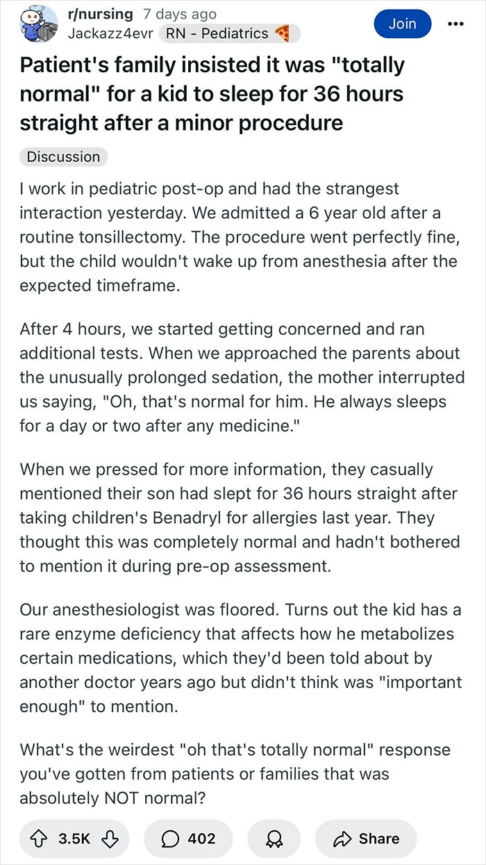 Sometimes what patients or their families consider "normal" can catch healthcare professionals completely off guard. Take the case of today's Original Poster (OP), whose patient's family believed their child's prolonged sleeping after being in anesthesia was normal, not knowing there was something deeper at play.