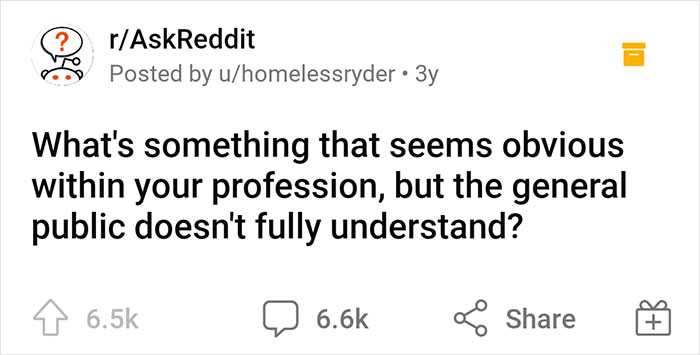 What’s interesting is that even the most no-brainer things about our jobs are often far from obvious to the general audience. This thread from Ask Reddit is a great example of it: “What's something that seems obvious within your profession, but the general public doesn't fully understand?” someone asked, and the illuminating responses started rolling in.