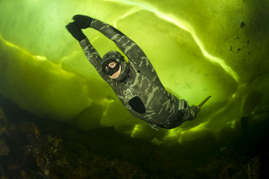 A freediver exercises dynamic apnoea below an iced platform, in the chilly salt water of the White Sea, at -2 degrees Celsius. "You have to be extremely prepared, brave and self-controlled to freedive," says photographer Franco Banfi. "Reaching this underwater world is an adventure in itself - a thick layer of ice freezes over the entry points every night due to very low temperatures, and every day one must new cut ice holes to regain access."
