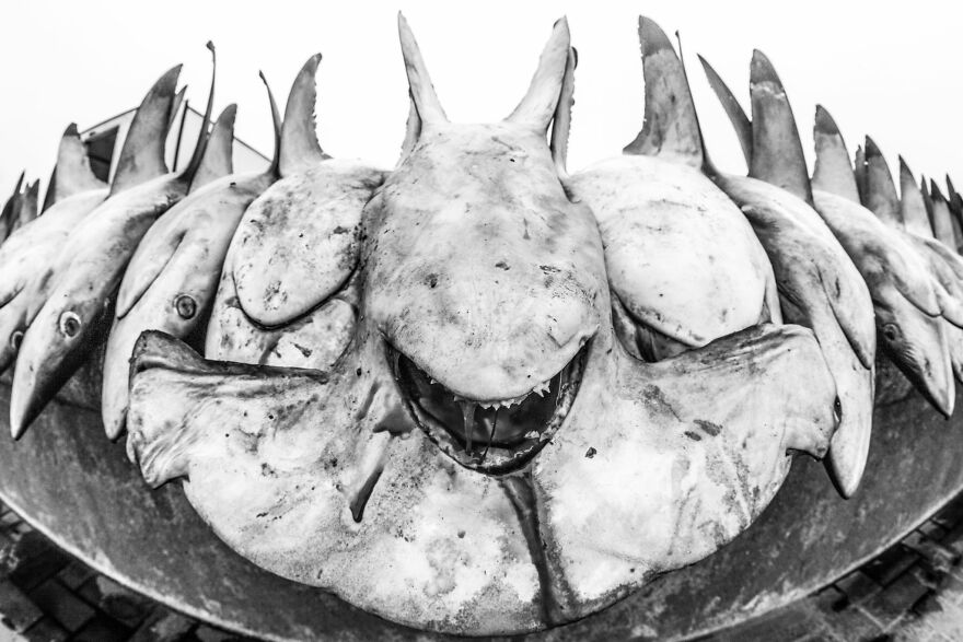 Sharks lined up at a fish market. "Several years ago, visiting the Dubai Fish market on any day, you would find hundreds of sharks - species I could only dream of encountering underwater - lined-up, lifeless, waiting to be auctioned. Endangered sharks like this smooth hammerhead were often traded from Oman to the UAE, their fins destined to the Asian markets. After their listing on CITES in 2014 much of this trade has become regulated and the UAE has fully protected the species, so these scenes are hopefully a memory from the past in Dubai, but remain a crude reality in many countries where protection is not yet in place."