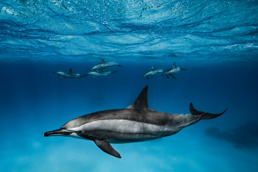 "This large pod of spinner dolphins hunt in the open ocean during the night before returning in the early morning to the Sataya reef lagoon to rest," says photographer Lucie Pollet. "They spend the day in the lagoon to rest, play, mate and learn. On this particular morning, the dolphins were curious and in a playful mood. We spent two hours with them, interacting. My heart was jumping with happiness and excitement. It was an amazing encounter."