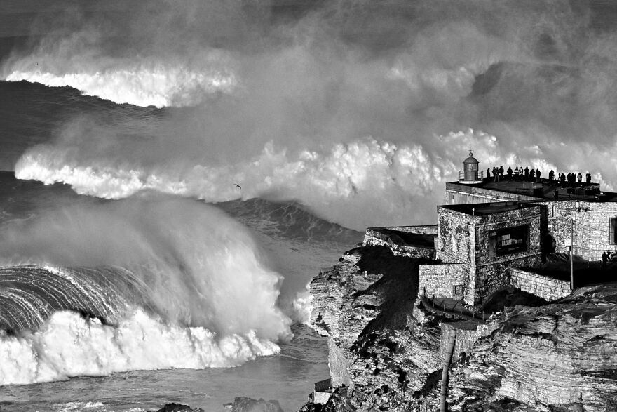 "Nazaré is widely known for its big waves, attracting hundreds of people worldwide to contemplate this amazing and beautiful demonstration of ocean power," says photographer Joao Pompeu. "I knew about the swell for big waves just two days before it. I managed to pick up a car in Northern Spain and drove 15 hours through the night, arriving at 6am in Nazaré. It was still dark, but I mounted my tripod where I found the composition and waited. The moment of three giant waves breaking with a perfect light lasted less than one minute, but was worth all the effort."