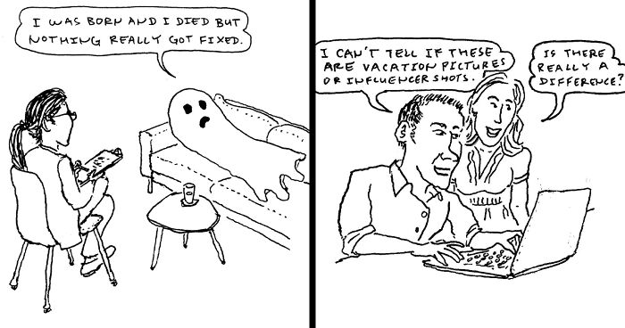 Steve McGinn makes minimalist comics using a Flair pen and a scanner. His drawings are simple but sharp, often diving into the weird, funny, and oddly relatable moments of everyday life. From awkward social situations to pop culture references, tech woes, and more, his cartoons land somewhere between absurd and totally spot-on.