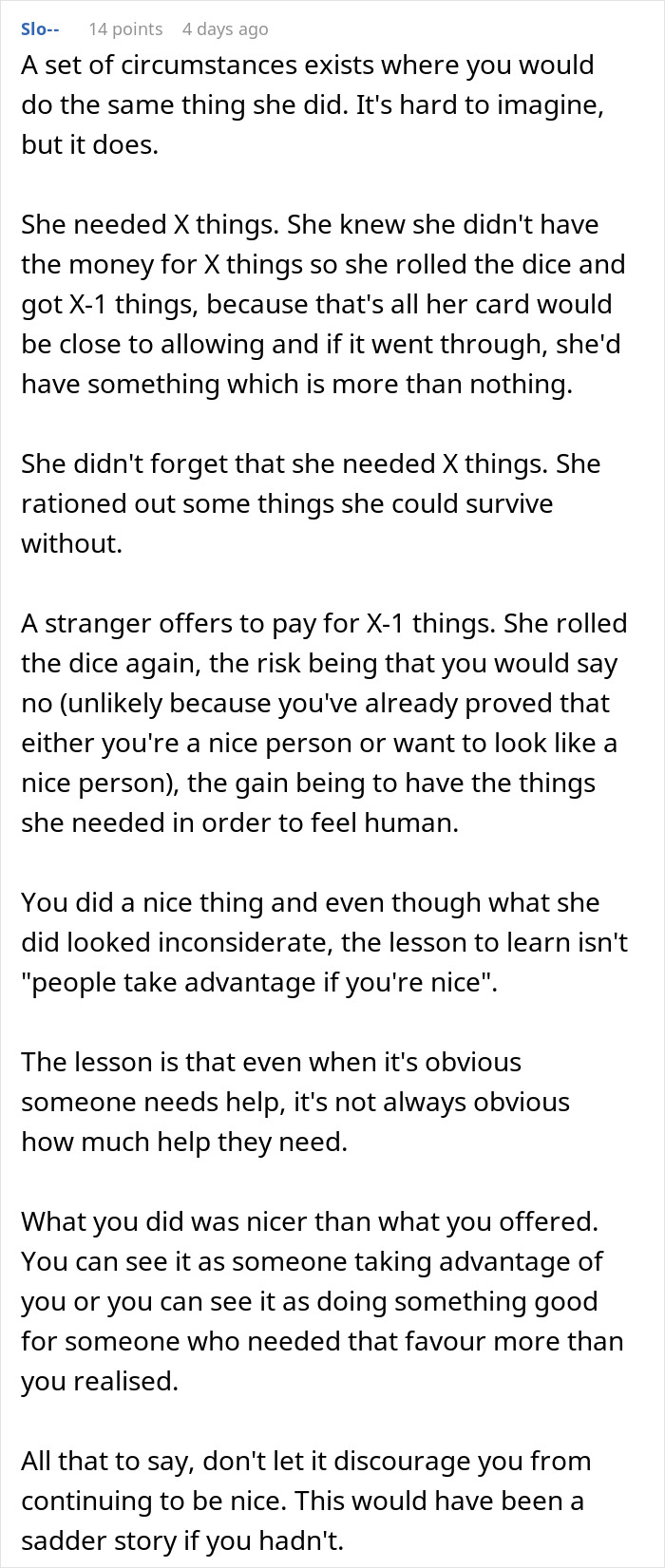 It’s also important to note that, as this netizen even wrote, she didn’t grab a bunch of luxuries, just things that it really seems she needed. Perhaps she literally didn’t have them, in which case, this person actually did her a very big favor. In any case, at worst, this was a sort of learning experience, that if one is to offer help, it’s still good to have some boundaries in place. Plus, given that this person did help, it does seem like they are the sort to care. This might suggest that had they not helped, they would be bothered by it for the rest of the day.