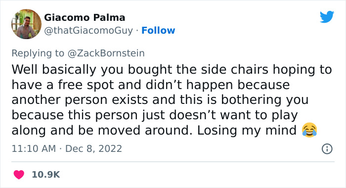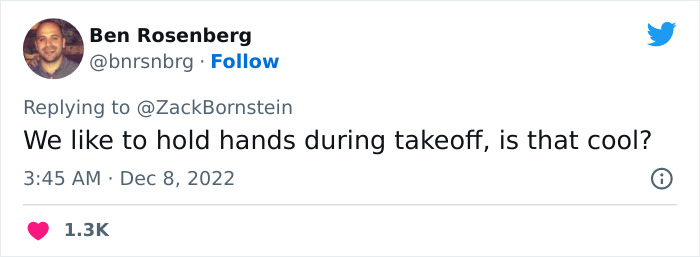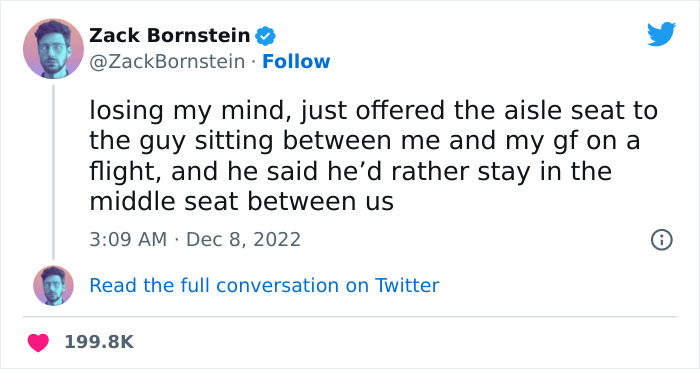 “Losing my mind, just offered the aisle seat to the guy sitting between me and my gf on a flight, and he said he’d rather stay in the middle seat between us,” tweeted Zack.