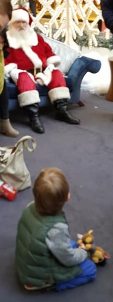 When my nephew was 3 we took him to see Santa at the mall. He was excited when we were waiting in line, but as soon as it was his turn he screamed and threw himself on the floor. This was as close as he would get to Santa and was giving him dirty looks the whole time. :) santa-62f4...fc2666.jpg