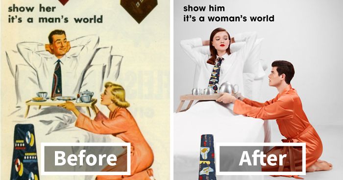 The image of a perfect woman in the 1950s is familiar to all of us – a diligent wife, slaving around the house all day, preparing delicious meals for her hardworking husband, taking care of the children, and all that with a smile, of course. This image was reflected a lot in the ads of that era too. Inspired by them, photographer and video editor from Beirut, Lebanon, Eli Rezkallah created a series called “In A Parallel Universe” where he switched up the gender roles portrayed in those ads to reveal the absurdity of such stereotypes with humor.