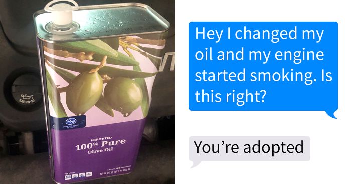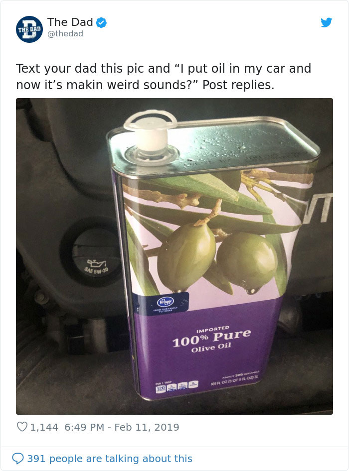 Kids are telling their dads that they just put olive oil in their engines, and waiting for the response. Luckily, dads are known for their amazing humor and usually fire back with a hilariously cheesy response, having seen straight through the 'challenge.' Some, however, fall for the prank and start to get a little, let's say...stressed.