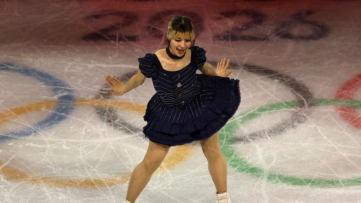 Figure skater Alysa Liu performing on ice with Olympic rings visible underneath during a competition.