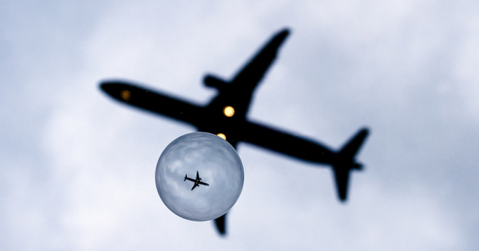 An airplane landing at Budapest, Hungary. It took much trial and swearing to take this photo. No software manipulation. This is a glass globe placed on a plexiglass sheet.