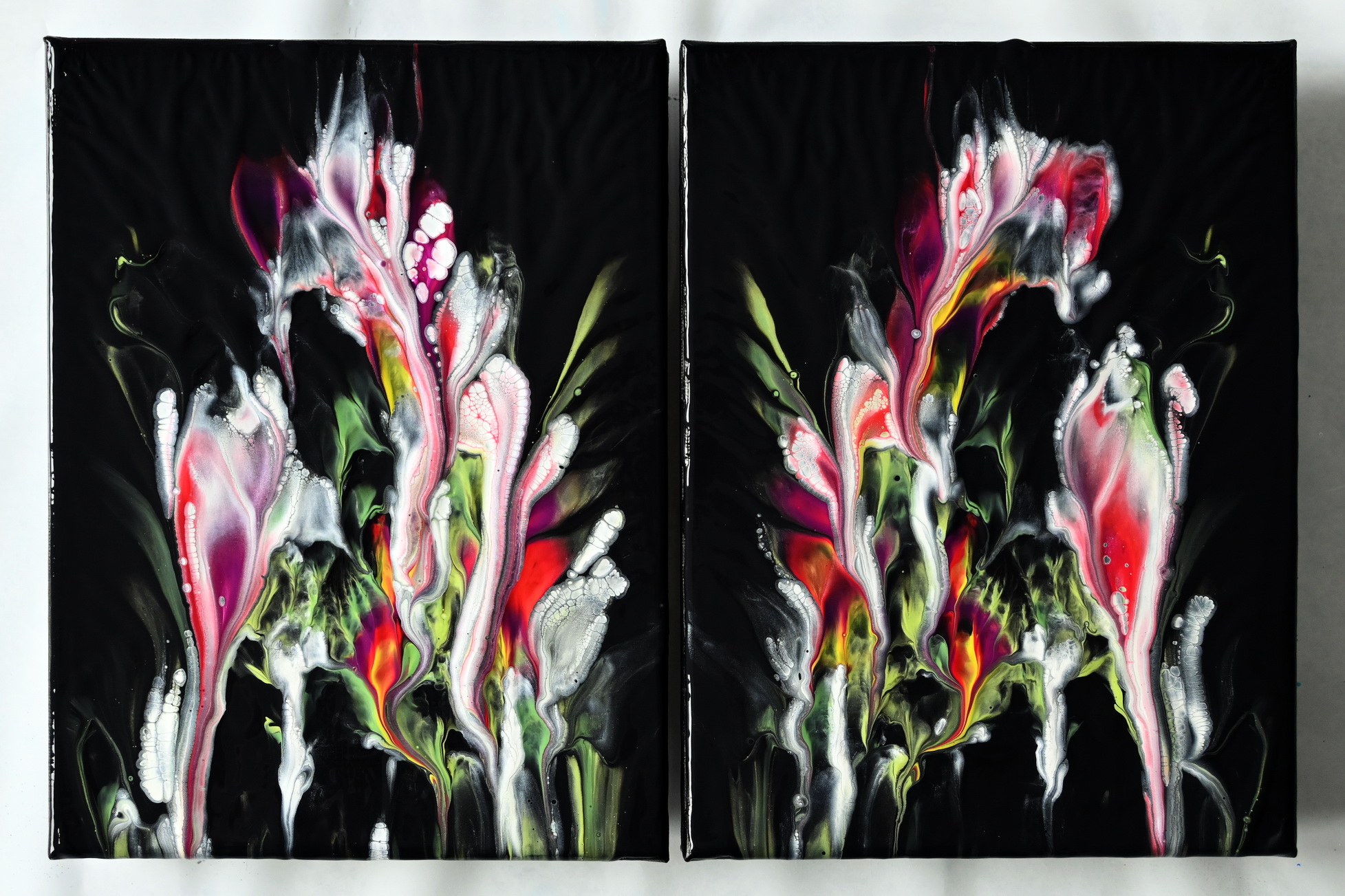 In this fluid art experiment, I used the double dip acrylic pouring technique to create a diptych—two canvases that share the same composition, movement, and energy.