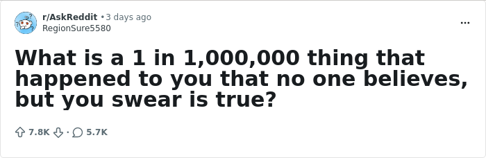 Someone asked, "What is a 1 in 1,000,000 thing that happened to you that no one believes, but you swear is true?" And the 5,700 comments that followed might give fact-checkers and statisticians enough work to last for weeks.