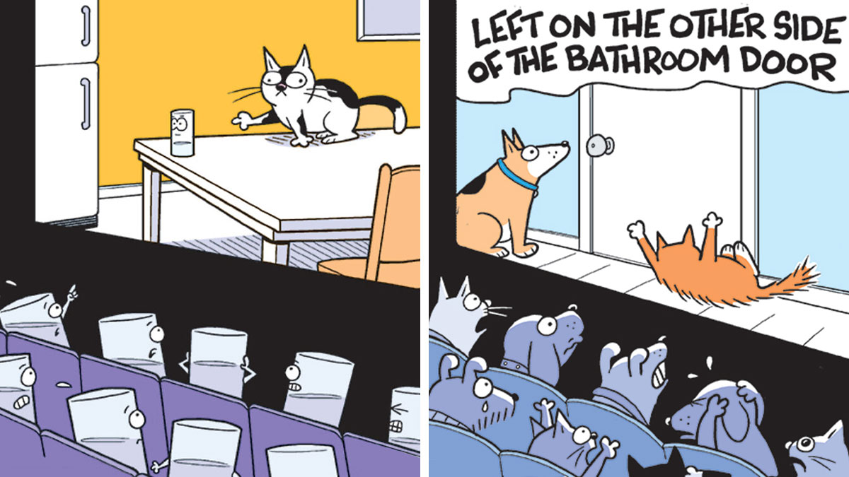 Artist Mark Parisi is known for his long-running comic panel Off The Mark, which humorously portrays everyday life and absurd situations. In the comics featured here, he imagines what horror movies would look like from the perspective of animals and objects, turning familiar scary scenes into funny moments that fans of both horror and comics can relate to.