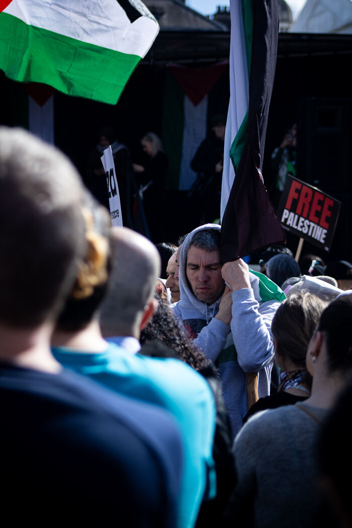 A man stands alone in the middle of a crowd of thousands. He grips a wooden pole that flies the flag of Palestine. His eyes closed as if lost in meditation.