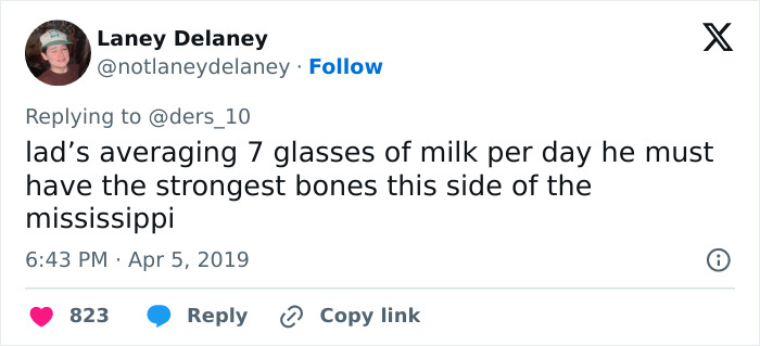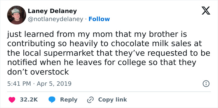 It's been a few years since Laney posted about their brother's passion for chocolate milk, but we reached out to them via email and lucky for us, they were happy to have a chat with Bored Panda. "I was a junior in college when I tweeted this, and my brother was a senior in high school," they explained. "He was on the school’s wrestling team and was burning a tremendous amount of calories. I did the math back then, and he was averaging around 7 glasses of chocolate milk per day."