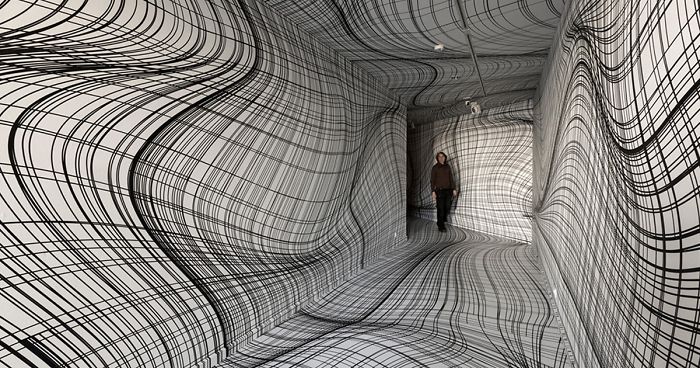 Peter Kogler, an internationally renowned Austrian artist who lives and works in Vienna, has hypnotized the world with his latest psychedelic installations at the ING Art Center in Brussels. Using paint and projections, he makes simple galleries, lobbies and transit centers look distorted, warped and twisted.