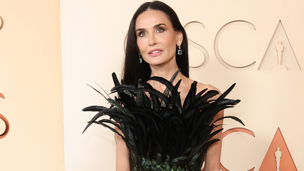 The Substance star stepped onto the Oscars red carpet in a dramatic, feathered Gucci gown featuring a strapless bodice with long black plumes.