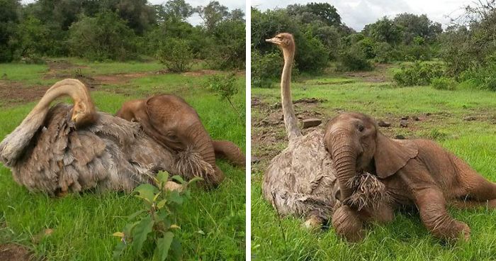 This Ostrich Snuggles Orphaned Elephants To Make Them Feel Better After Losing Their Moms