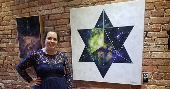With all these, I attempt to add some kind of illusory effect because things aren’t always as they seem. Besides my use of vivid colors to create vibrancy, there are several pieces in the series that can be looked at in multiple ways. For example, the shape may appear two-dimensional in one instance, but in another glance, it has a three-dimensional appearance. So many times, I’ve been humbled in life because I am certain something is one way just to be proven that my senses and logic are not always right. If we are aware of our limited senses and awareness, it makes it easier to be open to seeing things from multiple perspectives. I often wonder if my viewers first see these galaxy artworks flat or more dimensional, or if the stars and space dust seems to be within or behind the geometry. Even literally at different angles some of these pieces can be seen in another way because they’re packed with metallic paints that have a changing sheen depending on where you’re looking from. A handful also has glitter that appears to have sparkling stars when they catch the light just right.