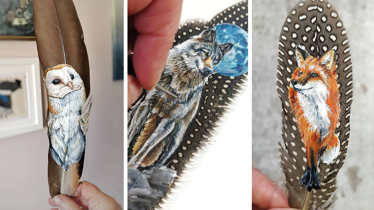 I love painting feathers and I have learnt so much about ornithology over the past eight years. All feathers behave differently so each new artwork is a challenge. I love pushing the boundaries and myself by painting multiple feathers at the same time or using particularly delicate feathers.