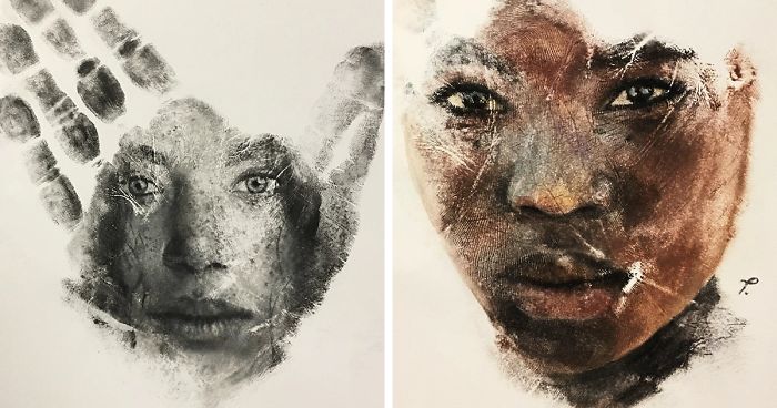 Artist Russell Powell (previously here) creates paintings that can’t be replicated. Russell – who works full time as a first-grade teacher in San Jose, California – paints stunning realistic portraits on his palms first, and only then stamps them on paper. He has to paint quickly enough so that his medium doesn’t dry, but the stamping showcases Powell’s unique fingerprints, making the images truly one-of-a-kind.